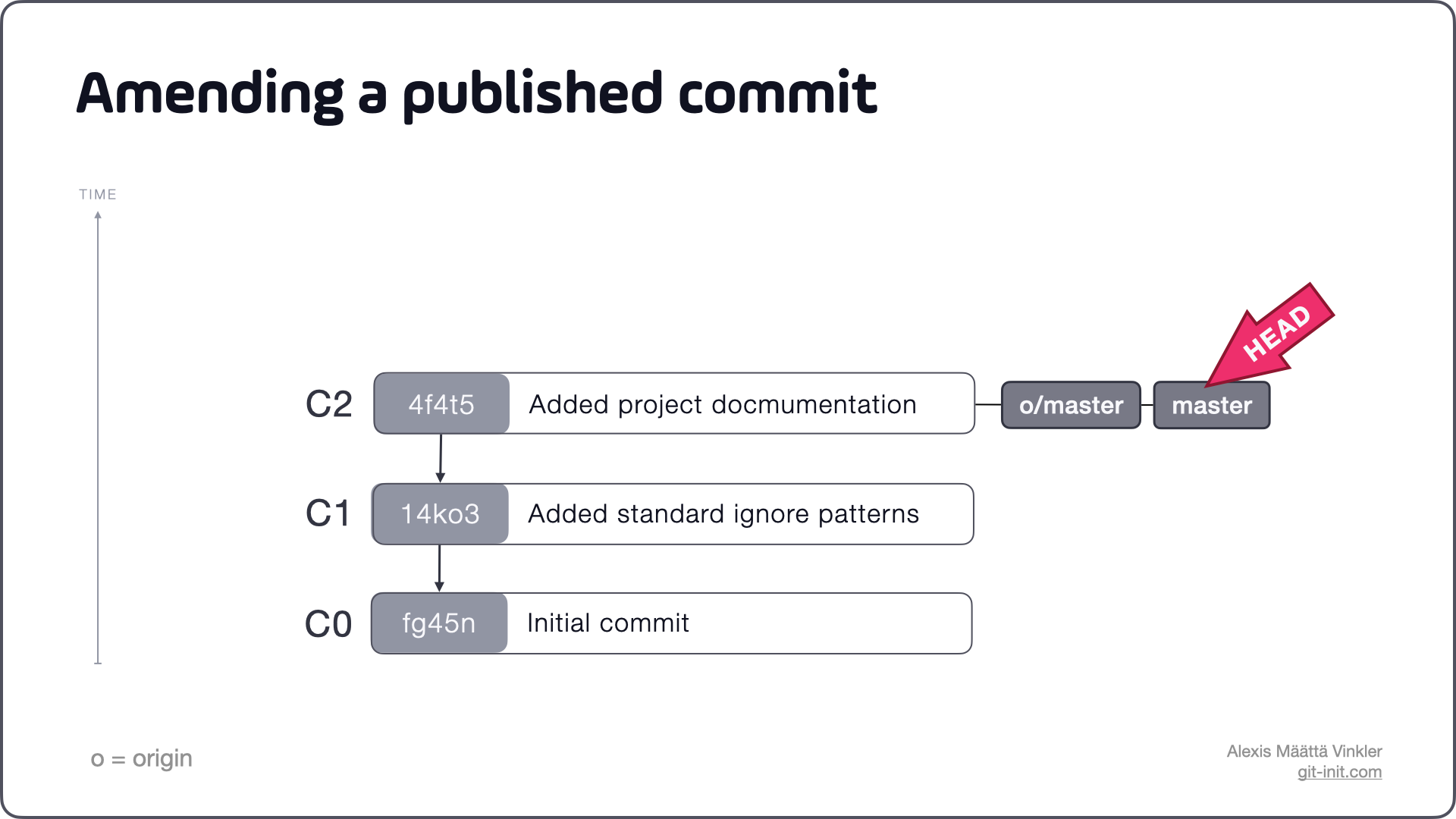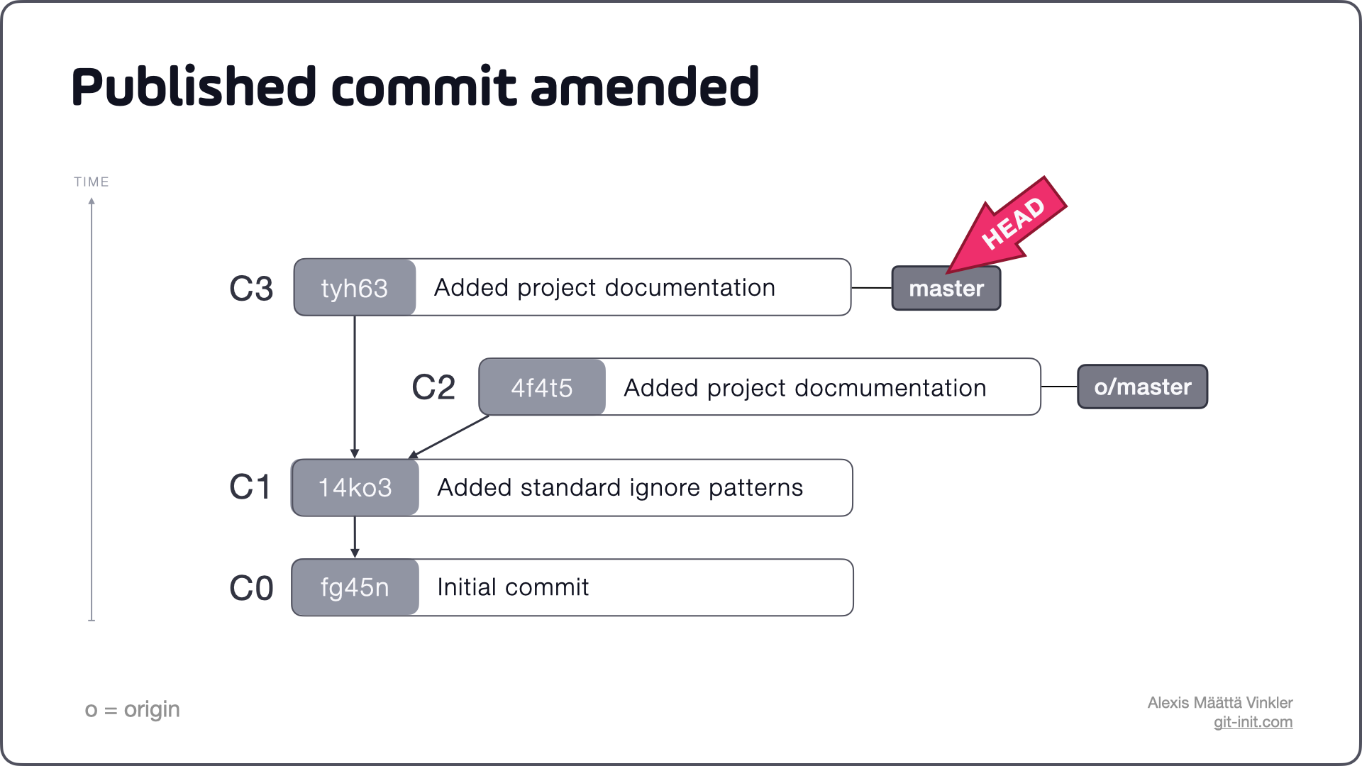 What if C2 would have been published already? What would the history then look like post amending? In this scenario, the fact that no commits can be altered becomes even clearer, as we can easily see how the two histories now have diverged.