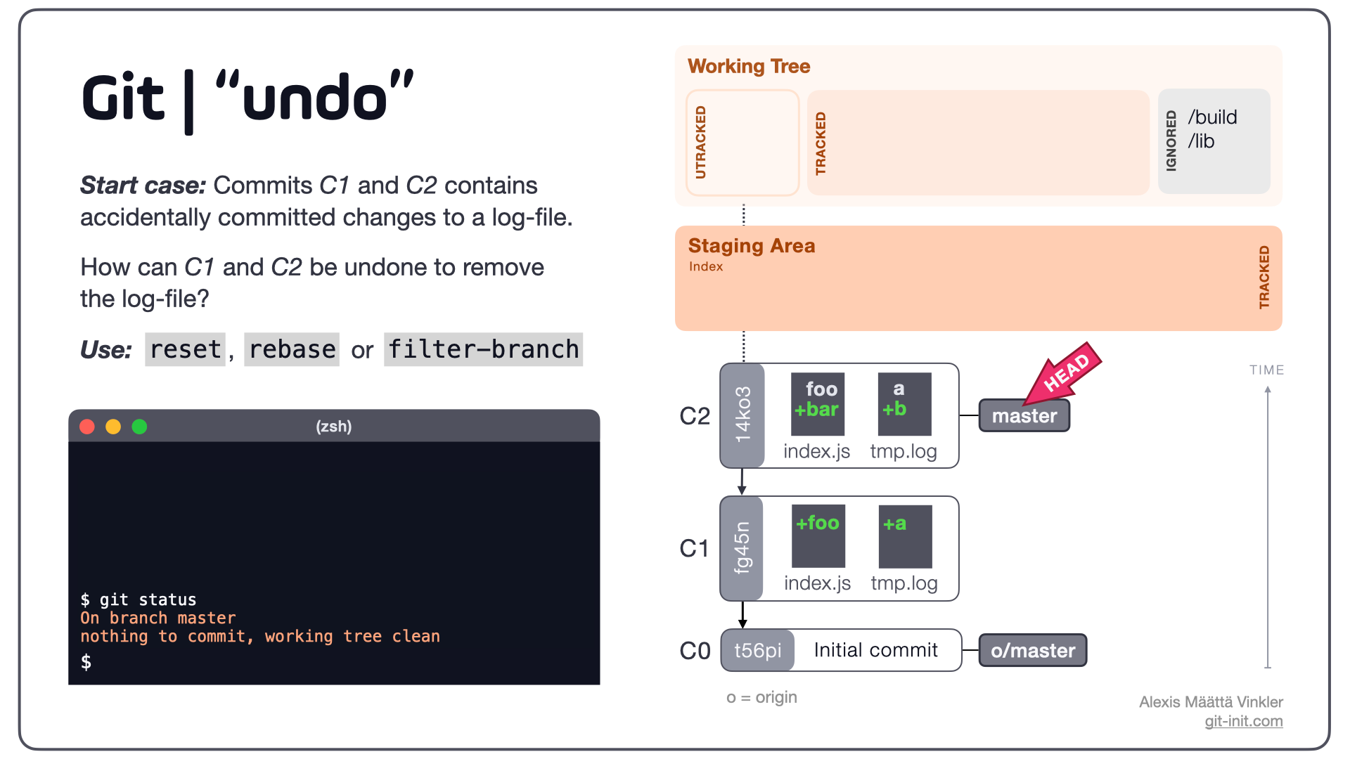 Notice that none of the two commits (C1 & C2) have been pushed remotely, and only exist in the local master branch, allowing us to easily rewrite history as we please. Now, let's see how the accidentally committed file tmp.log can be removed from the history and C1 & C2 redone.