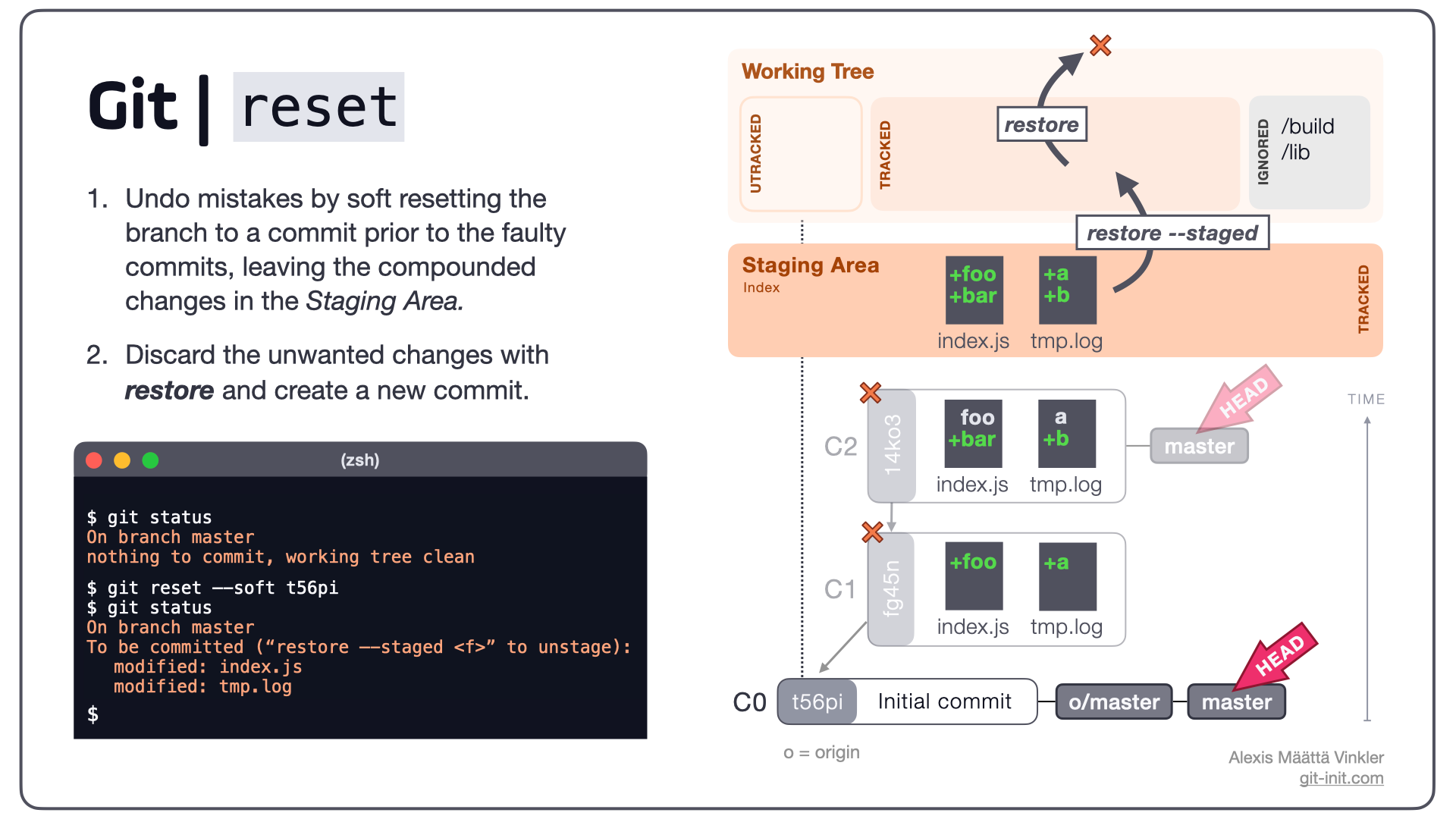 With reset, a branch can be reset to a previous state, and any compounded changes be reverted to the Staging Area, from where any unwanted changes can then be discarded. Below illustration showcases how undoing changes from our initial start case looks like using a "soft reset":